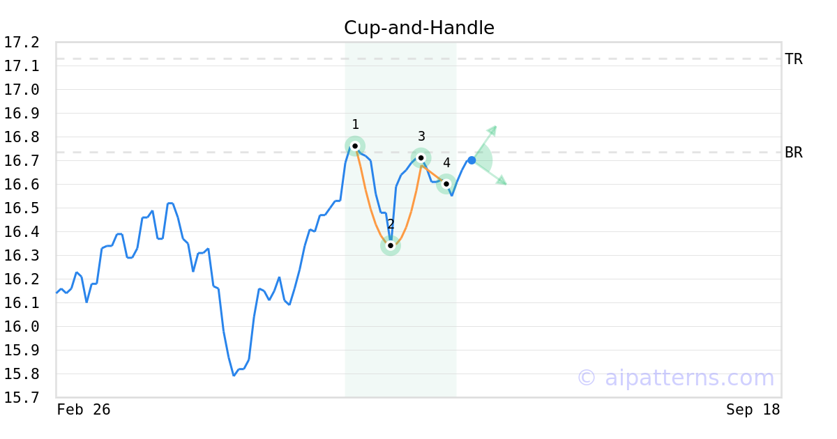 The Cup-and-Handle (sometimes called Cup-and-Holder) pattern is formed when the price of a security initially declines and then rises to form a “U”-like rounded shape (1, 2, 3, also known as the Cup). Once it forms the right lip, it is characterized by short, relatively straight price decline (from 3 to 4) forming the handle.