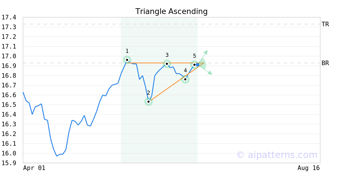 A.I.dvisor detected a bullish Triangle Ascending pattern for MVGIX stock. This pattern was detected on June 20, 2024 . The odds of reaching the target price are . The Ascending Triangle pattern forms when the price of a security tests a resistance level and creates a horizontal top line (1, 3, 5), with an upward-sloping bottom line (2, 4) formed by a rising support level. Consider buying a security at the upward breakout level.
