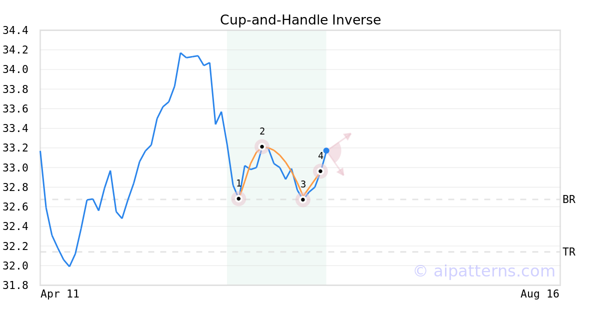 A.I.dvisor detected a bearish Cup-and-Handle Inverse pattern for MWMIX stock. This pattern was detected on June 20, 2024 . The odds of reaching the target price are 6.