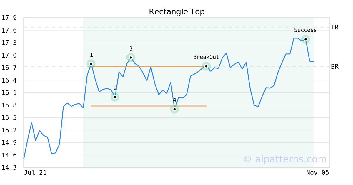 On September 24, 2025, A.I.dvisor detected a Rectangle Top Pattern (Bullish) for Myers Industries (MYE, $16.73). On September 24, 2025, A.I.dvisor confirmed the Bullish pattern, setting a target price of $17.68. 35 days later, on October 29, 2025, MYE reached the target price resulting in a for traders who took a long position in the stock.