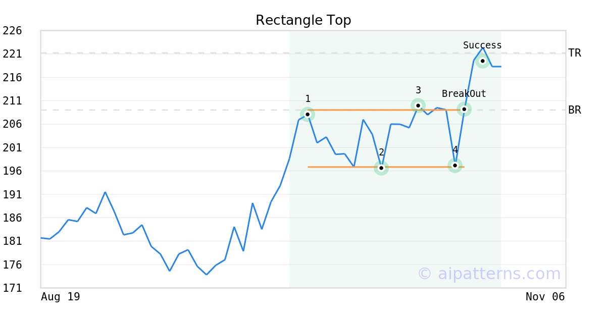 On October 23, 2025, A.I.dvisor detected a Rectangle Top Pattern (Bullish) for MYR Group (MYRG, $209.14). On October 23, 2025, A.I.dvisor confirmed the Bullish pattern, setting a target price of $221.21. 4 days later, on October 27, 2025, MYRG reached the target price resulting in a for traders who took a long position in the stock.