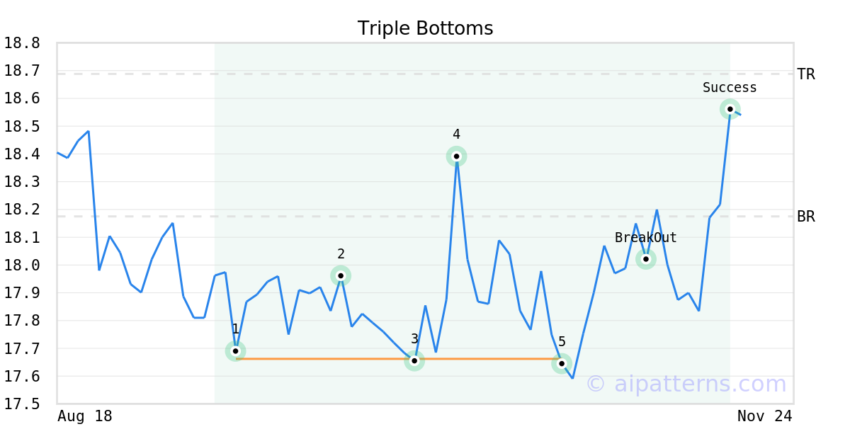 On October 24, 2025, A.I.dvisor detected a Triple Bottoms Pattern (Bullish) for ProShares Short MidCap400 (MYY, $17.64). On November 05, 2025, A.I.dvisor confirmed the Bullish pattern, setting a target price of $18.69. 12 days later, on November 17, 2025, MYY reached the target price resulting in a for traders who took a long position in the stock.