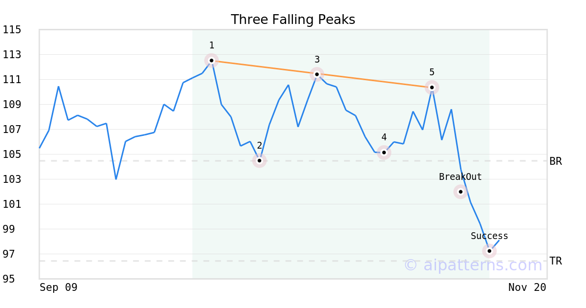 On November 05, 2025, A.I.dvisor detected a Three Falling Peaks Pattern (Bearish) for Nathan's Famous (NATH, $110.34). 5 days later, on November 10, 2025, A.I.dvisor confirmed the Bearish pattern, setting a target price of the stock. On November 13, 2025, the stock hit the target price of $96.44 – resulting in a +1 gain for traders who shorted the stock on the pattern detection date.