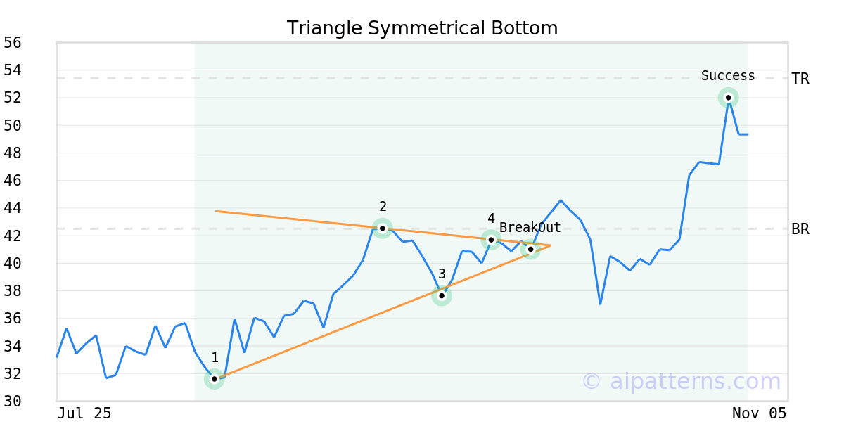 On October 02, 2025, A.I.dvisor detected a Triangle Symmetrical Bottom Pattern (Bullish) for Nabors Industries Ltd (NBR, $40.99). On October 02, 2025, A.I.dvisor confirmed the Bullish pattern, setting a target price of $53.42. 27 days later, on October 29, 2025, NBR reached the target price resulting in a +2 for traders who took a long position in the stock.