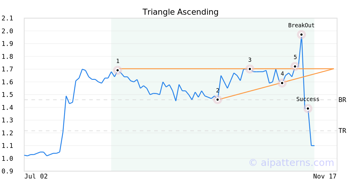 On October 30, 2025, A.I.dvisor detected a Triangle Ascending Pattern (Bearish) for Nocera (NCRA, $1.72). 4 days later, on November 03, 2025, A.I.dvisor confirmed the Bearish pattern, setting a target price of the stock. On November 05, 2025, the stock hit the target price of $1.22 – resulting in a +1 gain for traders who shorted the stock on the pattern detection date.