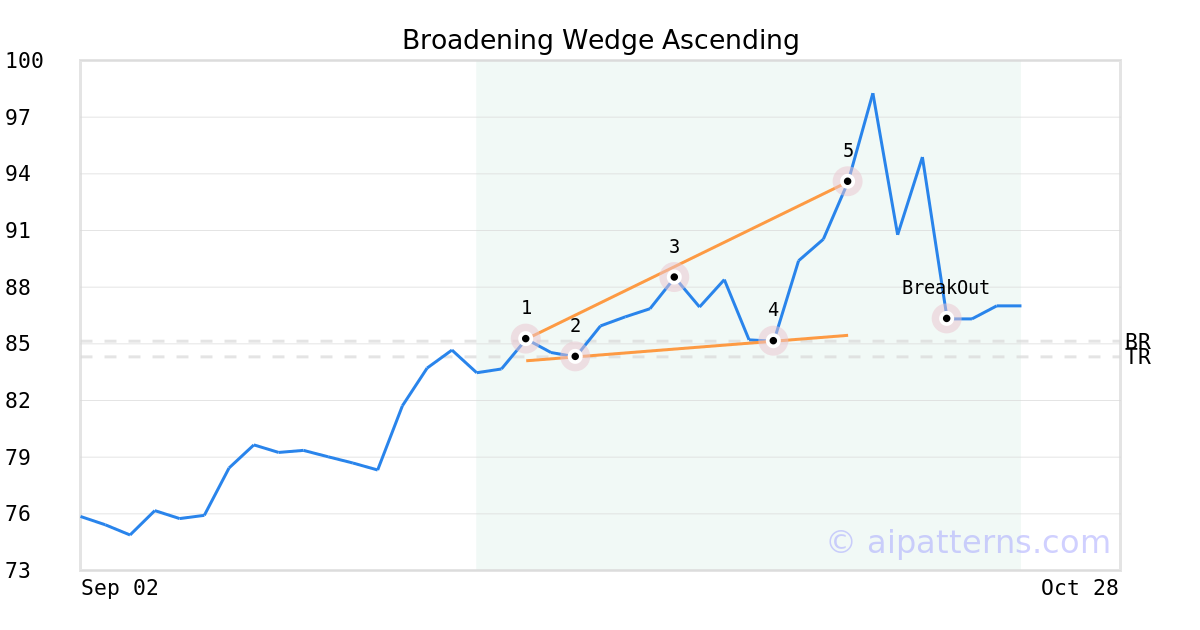 On October 15, 2025, A.I.dvisor detected a Broadening Wedge Ascending Pattern (Bearish) for Newmont Corp (NEM, $93.58). 6 days later, on October 21, 2025, A.I.dvisor confirmed the Bearish pattern, setting a target price of the stock. On October 21, 2025, the stock hit the target price of $84.31 – resulting in a gain for traders who shorted the stock on the pattern detection date.