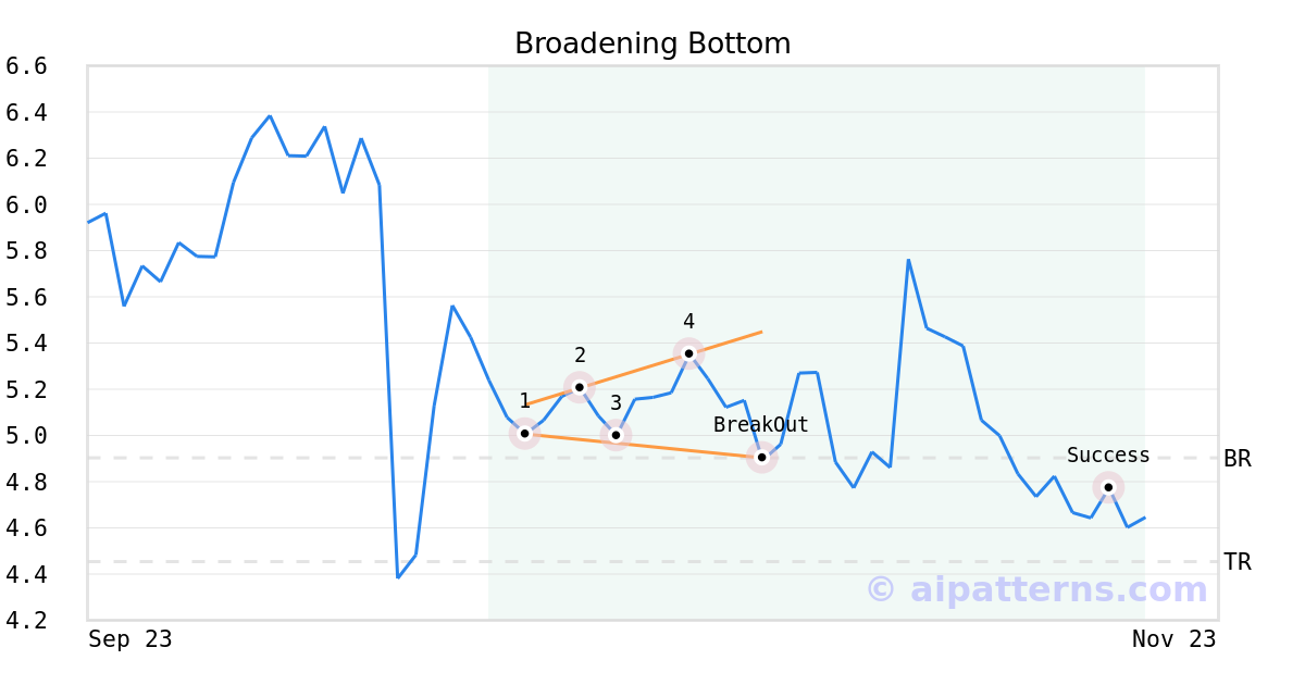 On October 30, 2025, A.I.dvisor detected a Broadening Bottom Pattern (Bearish) for Neo cryptocurrency (NEO.X, $4.898857). On October 30, 2025, A.I.dvisor confirmed the Bearish pattern, setting a target price of the stock. On November 18, 2025, the stock hit the target price of $4.454000 – resulting in a gain for traders who shorted the stock on the pattern detection date.