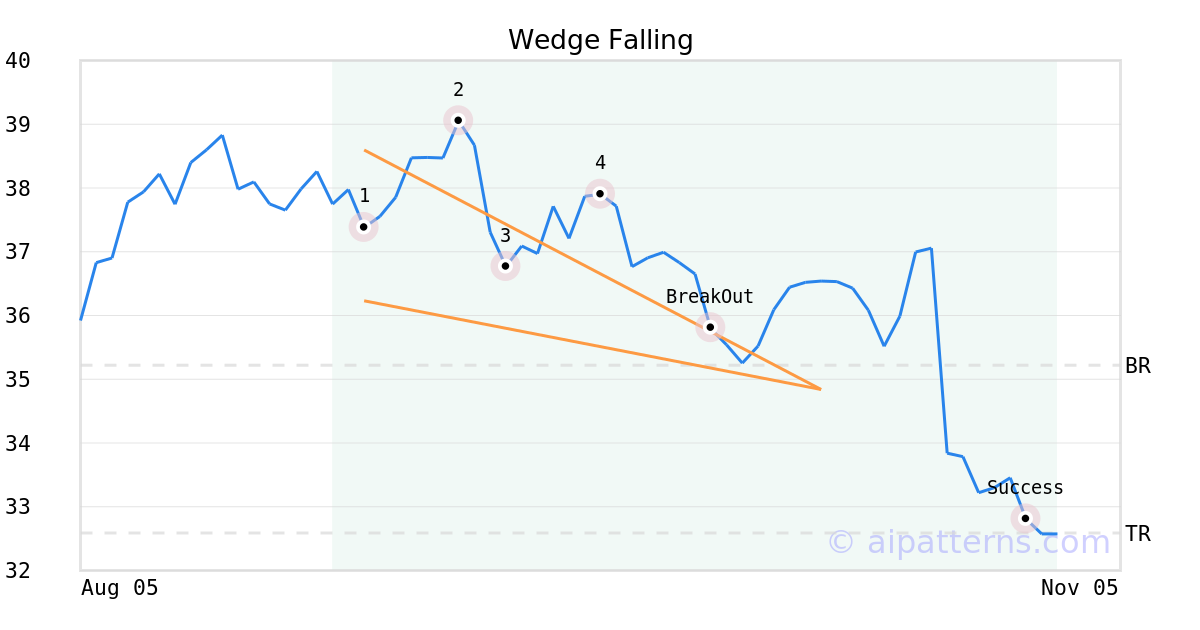 On October 01, 2025, A.I.dvisor detected a Wedge Falling Pattern (Bearish) for Kurv Yield Premium Str Netflix ETF (NFLP, $35.22). On October 01, 2025, A.I.dvisor confirmed the Bearish pattern, setting a target price of the stock. On October 29, 2025, the stock hit the target price of $32.59 – resulting in a gain for traders who shorted the stock on the pattern detection date.