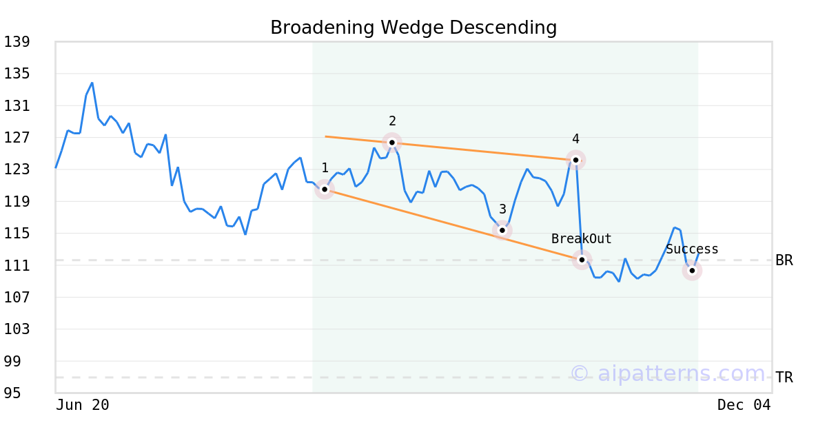 On October 22, 2025, A.I.dvisor detected a Broadening Wedge Descending Pattern (Bearish) for Netflix Inc. (NFLX, $111.64). On October 22, 2025, A.I.dvisor confirmed the Bearish pattern, setting a target price of the stock. On November 17, 2025, the stock hit the target price of $96.95 – resulting in a gain for traders who shorted the stock on the pattern detection date.