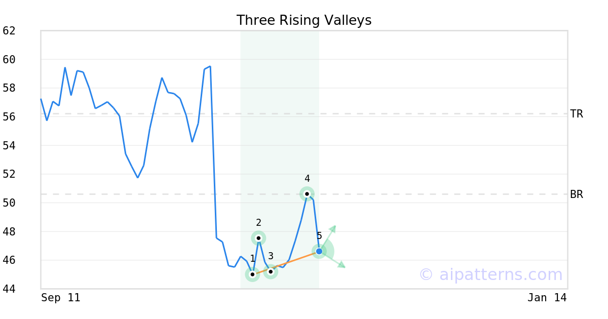 The Three Rising Valleys pattern forms when three minor Lows (1, 3, 5) are arranged along an upward sloping trend line.