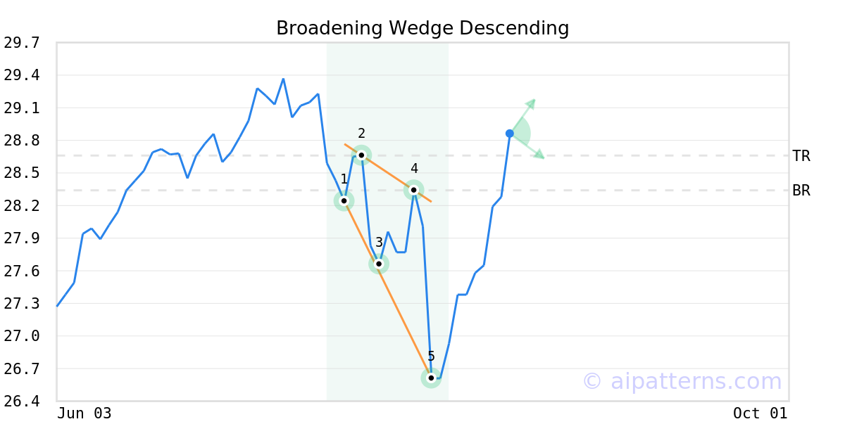 A.I.dvisor detected a bullish Broadening Wedge Descending pattern for NGRDX stock. This pattern was detected on August 05, 2024 . The odds of reaching the target price are 6. The Broadening Wedge Descending pattern forms when the price of a security makes lower lows (1, 3, 5) and lower highs (2, 4), forming a downtrend. Consider buying a security or call option at the upward breakout price level.