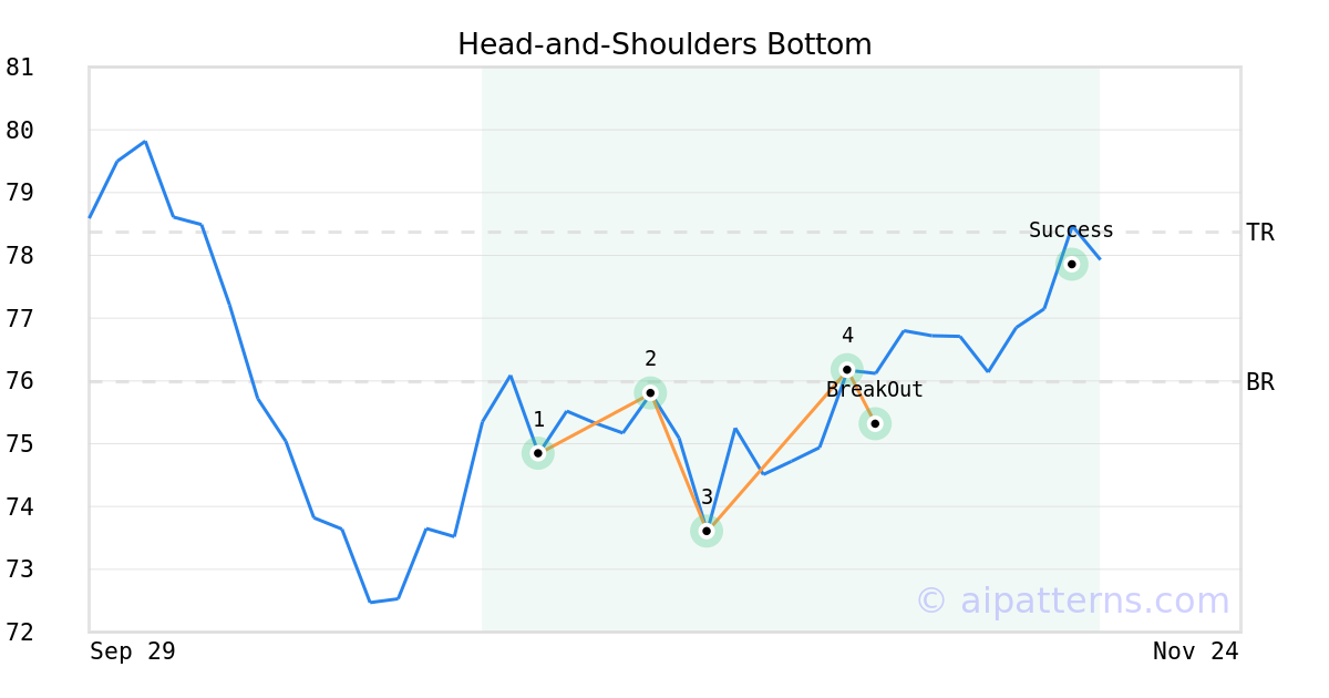On November 06, 2025, A.I.dvisor detected a Head-and-Shoulders Bottom Pattern (Bullish) for National Health Investors (NHI, $75.31). On November 06, 2025, A.I.dvisor confirmed the Bullish pattern, setting a target price of $78.37. 11 days later, on November 17, 2025, NHI reached the target price resulting in a for traders who took a long position in the stock.
