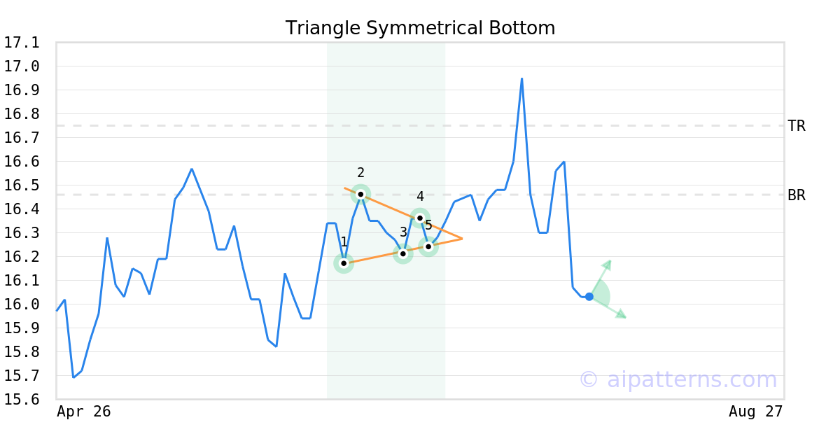 The Symmetrical Triangle Bottom pattern forms when the price of a security fails to retest a high or a low and ultimately forms two narrowing trend lines. As the support and resistance levels consolidate, they form a triangle.