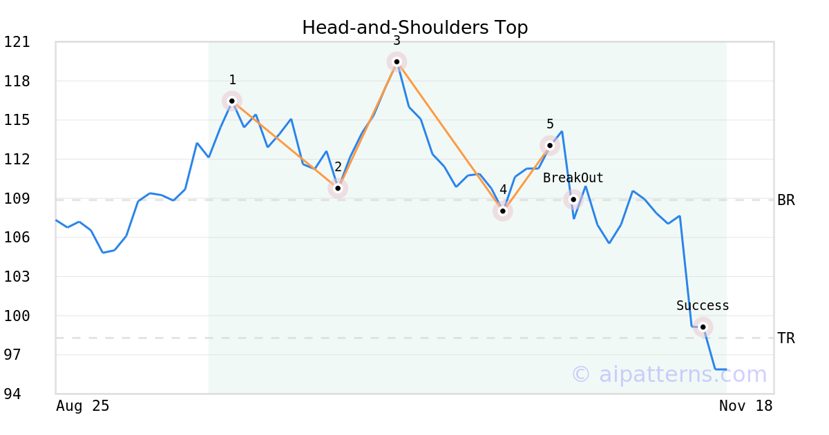 On October 23, 2025, A.I.dvisor detected a Head-and-Shoulders Top Pattern (Bearish) for National Presto Industries (NPK, $113.02). 4 days later, on October 27, 2025, A.I.dvisor confirmed the Bearish pattern, setting a target price of the stock. On November 11, 2025, the stock hit the target price of $98.29 – resulting in a +1 gain for traders who shorted the stock on the pattern detection date.