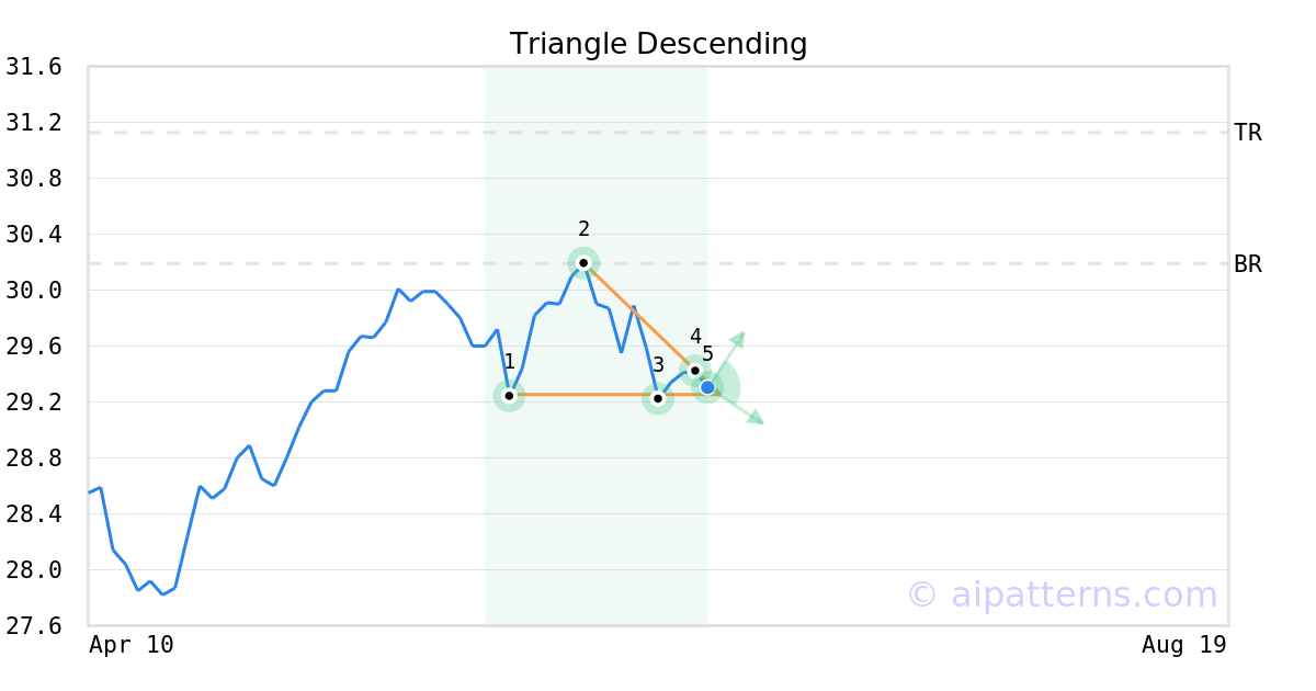 The Descending Triangle pattern is formed when the price of a security establishes a support level (1, 3, 5) and bounces off that level to a declining resistance level, creating a down-sloping top line (2, 4).