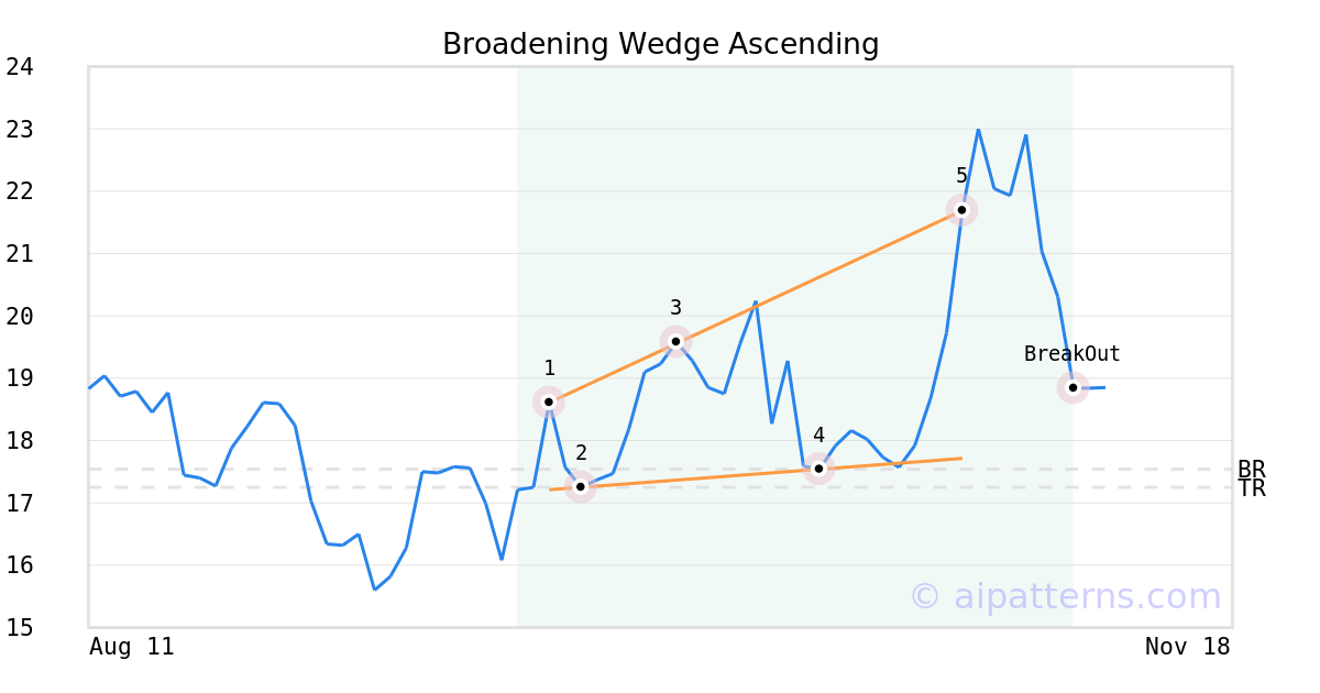 On October 28, 2025, A.I.dvisor detected a Broadening Wedge Ascending Pattern (Bearish) for T-REX 2X Long NVIDIA Daily Target ETF (NVDX, $21.69). 9 days later, on November 06, 2025, A.I.dvisor confirmed the Bearish pattern, setting a target price of the stock. On November 06, 2025, the stock hit the target price of $17.25 – resulting in a +1 gain for traders who shorted the stock on the pattern detection date.