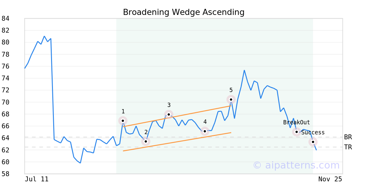 On October 09, 2025, A.I.dvisor detected a Broadening Wedge Ascending Pattern (Bearish) for NVE Corp (NVEC, $69.39). 28 days later, on November 06, 2025, A.I.dvisor confirmed the Bearish pattern, setting a target price of the stock. On November 13, 2025, the stock hit the target price of $62.48 – resulting in a gain for traders who shorted the stock on the pattern detection date.