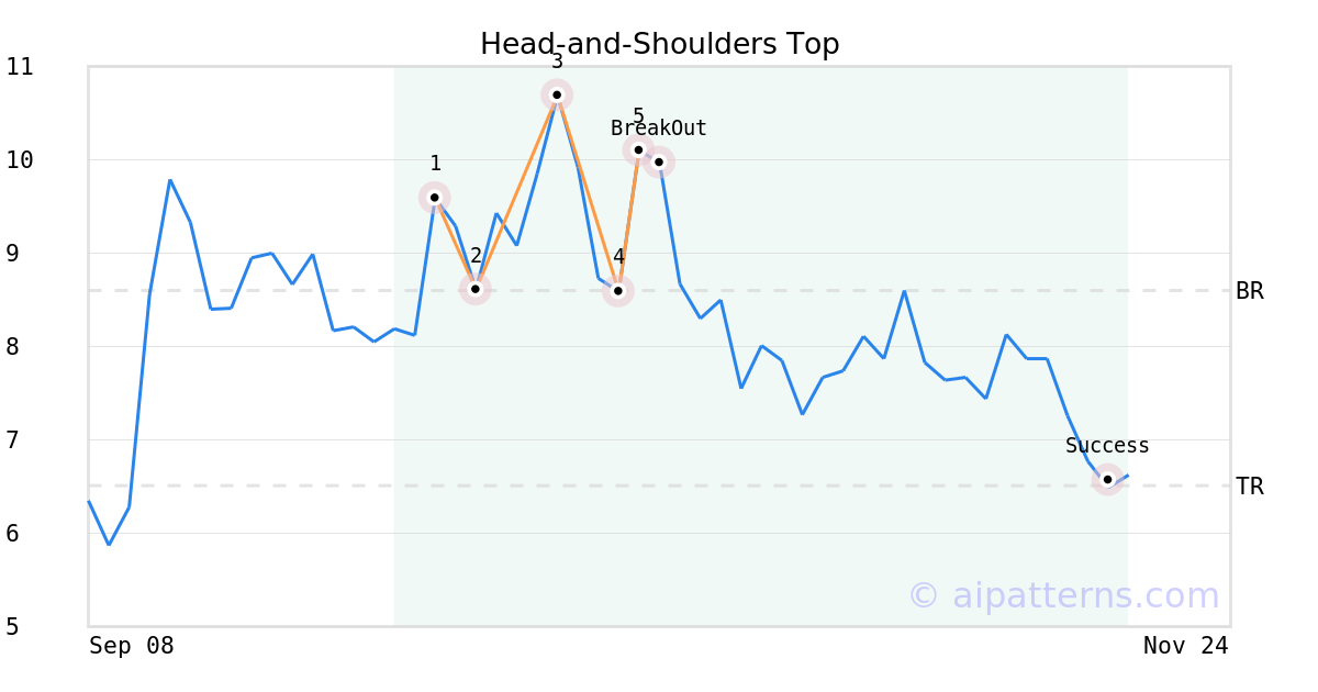 On October 15, 2025, A.I.dvisor detected a Head-and-Shoulders Top Pattern (Bearish) for Optical Cable Corp (OCC, $10.10). 1 day later, on October 16, 2025, A.I.dvisor confirmed the Bearish pattern, setting a target price of the stock. On November 17, 2025, the stock hit the target price of $6.51 – resulting in a +3 gain for traders who shorted the stock on the pattern detection date.