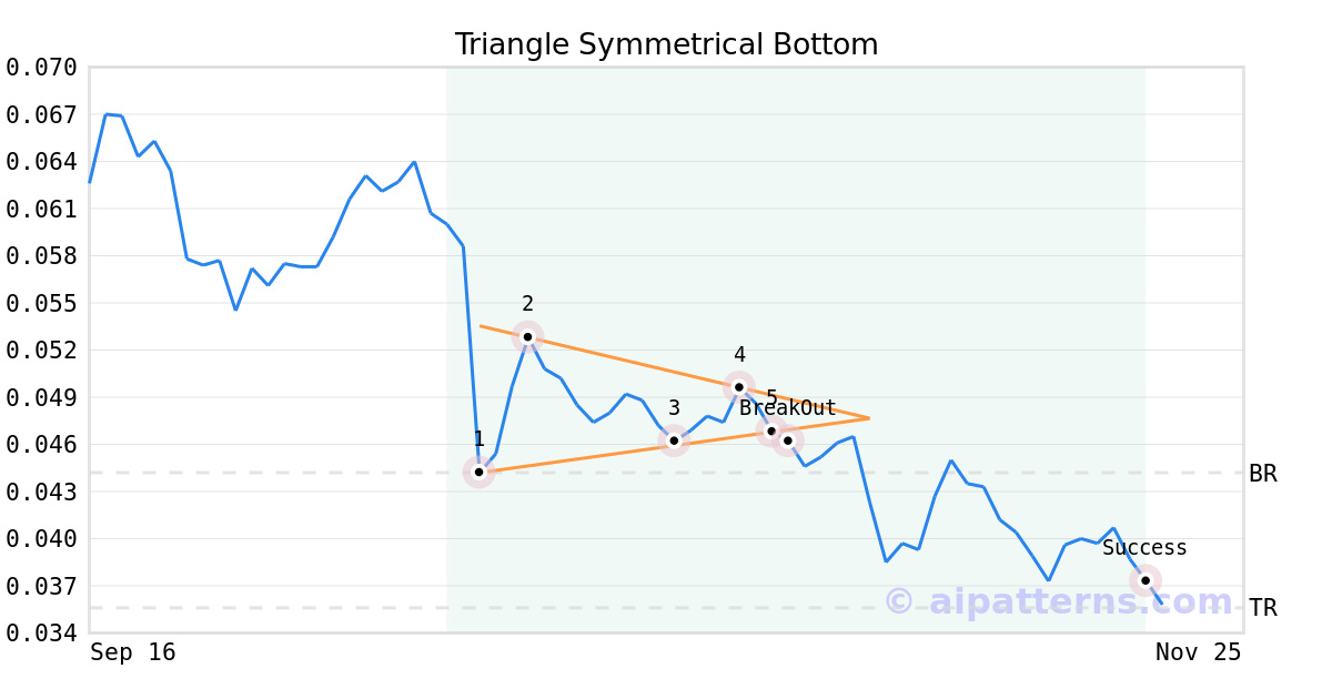 On October 28, 2025, A.I.dvisor detected a Triangle Symmetrical Bottom Pattern (Bearish) for Origin Protocol cryptocurrency (OGN.X, $0.046926). 1 day later, on October 29, 2025, A.I.dvisor confirmed the Bearish pattern, setting a target price of the stock. On November 20, 2025, the stock hit the target price of $0.035600 – resulting in a +2 gain for traders who shorted the stock on the pattern detection date.