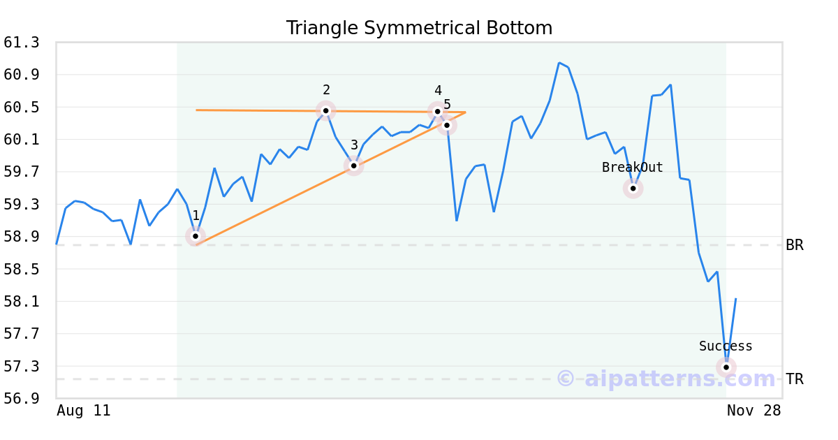 On October 09, 2025, A.I.dvisor detected a Triangle Symmetrical Bottom Pattern (Bearish) for Invesco Russell 1000® Dynamic Mltfct ETF (OMFL, $60.27). 28 days later, on November 06, 2025, A.I.dvisor confirmed the Bearish pattern, setting a target price of the stock. On November 20, 2025, the stock hit the target price of $57.14 – resulting in a gain for traders who shorted the stock on the pattern detection date.