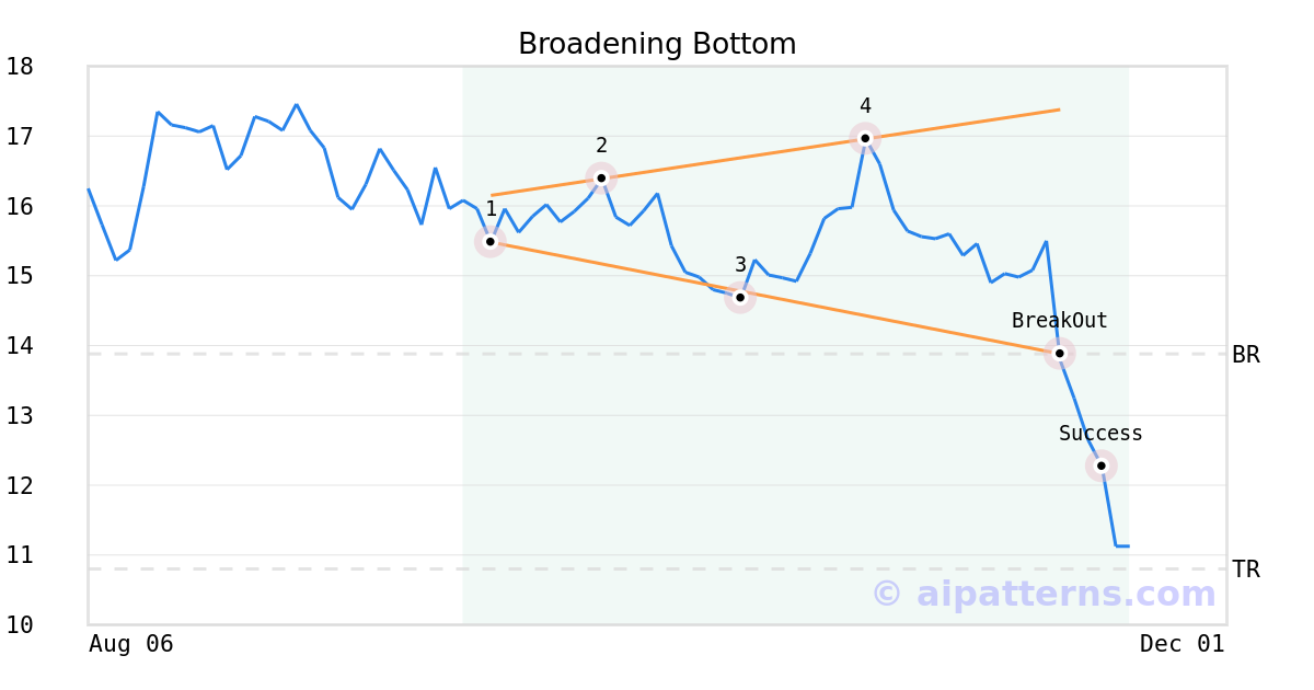 On November 13, 2025, A.I.dvisor detected a Broadening Bottom Pattern (Bearish) for OneWater Marine (ONEW, $13.88). On November 13, 2025, A.I.dvisor confirmed the Bearish pattern, setting a target price of the stock. On November 18, 2025, the stock hit the target price of $10.80 – resulting in a +1 gain for traders who shorted the stock on the pattern detection date.