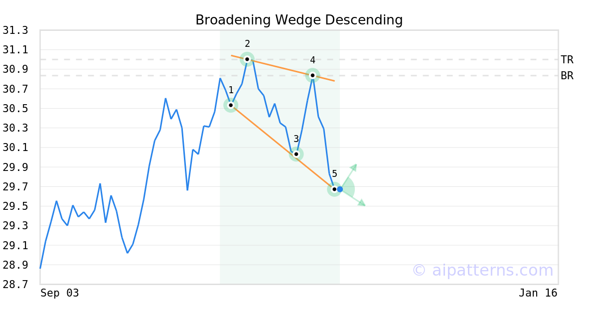 The Broadening Wedge Descending pattern forms when the price of a security makes lower lows (1, 3, 5) and lower highs (2, 4), forming a downtrend.