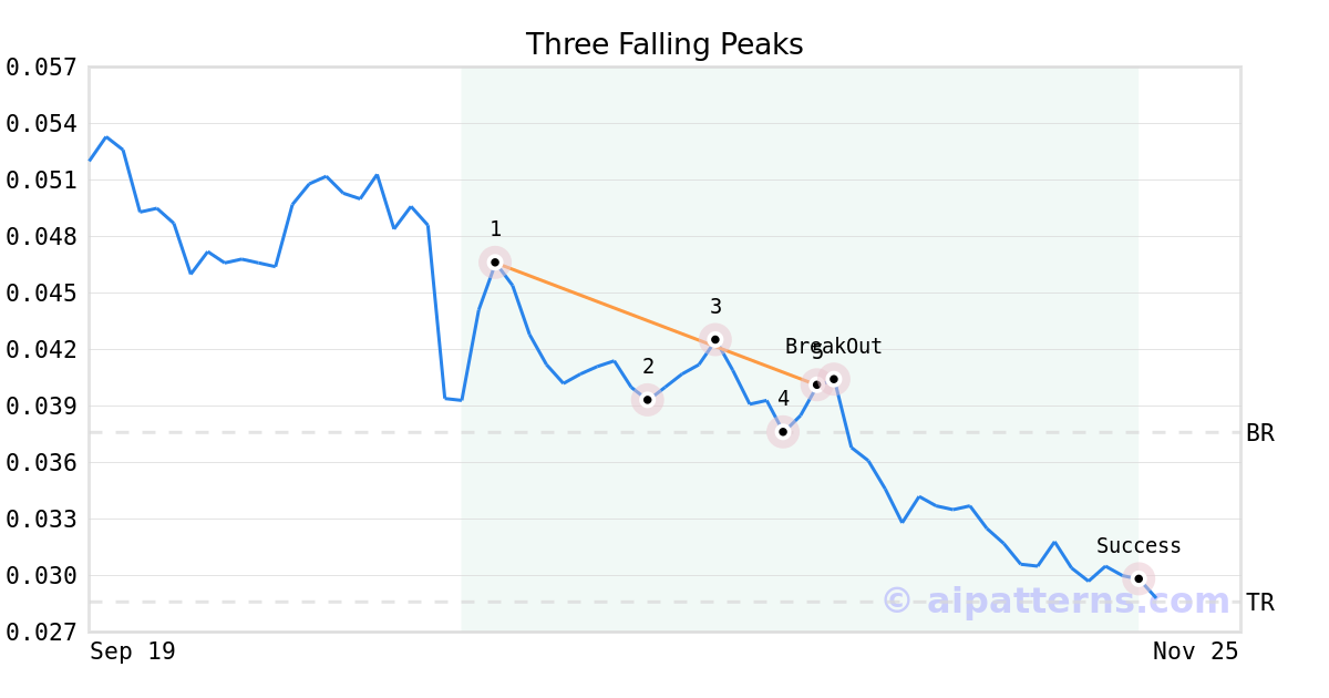 On November 01, 2025, A.I.dvisor detected a Three Falling Peaks Pattern (Bearish) for Orchid cryptocurrency (OXT.X, $0.039916). 1 day later, on November 02, 2025, A.I.dvisor confirmed the Bearish pattern, setting a target price of the stock. On November 20, 2025, the stock hit the target price of $0.028600 – resulting in a +2 gain for traders who shorted the stock on the pattern detection date.