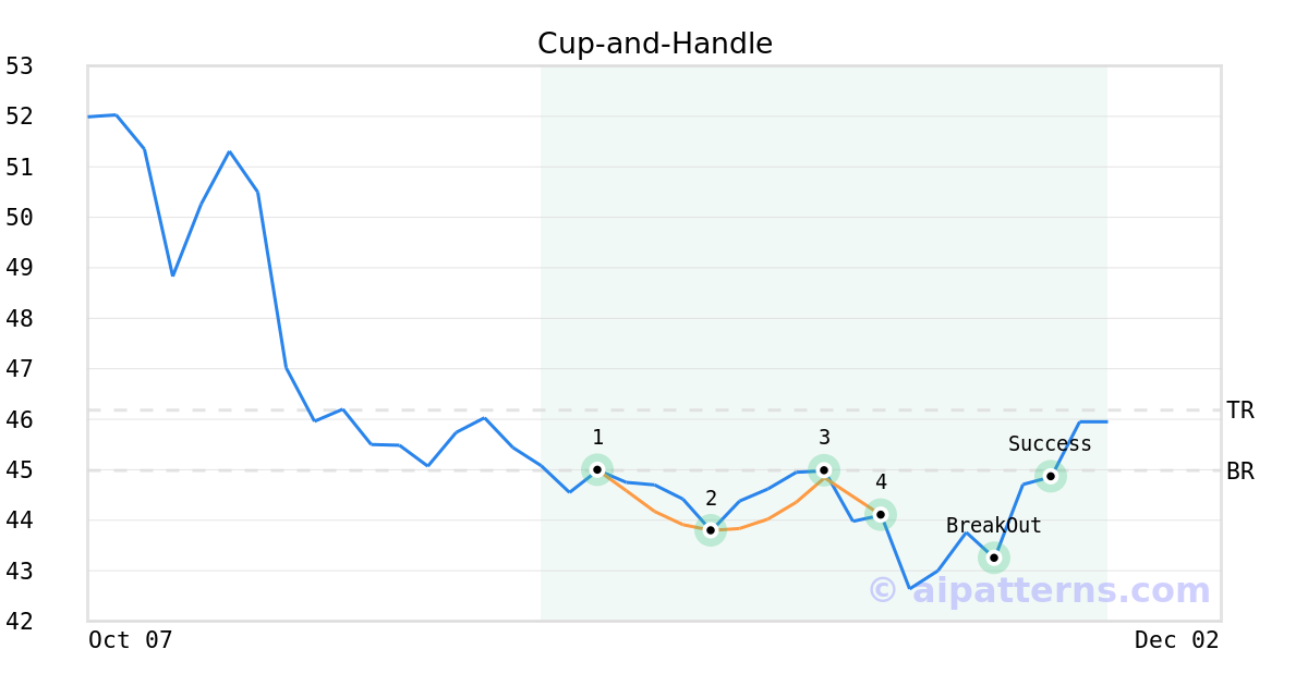On November 14, 2025, A.I.dvisor detected a Cup-and-Handle Pattern (Bullish) for Bank OZK (OZK, $44.10). On November 20, 2025, A.I.dvisor confirmed the Bullish pattern, setting a target price of $46.18. 4 days later, on November 24, 2025, OZK reached the target price resulting in a for traders who took a long position in the stock.