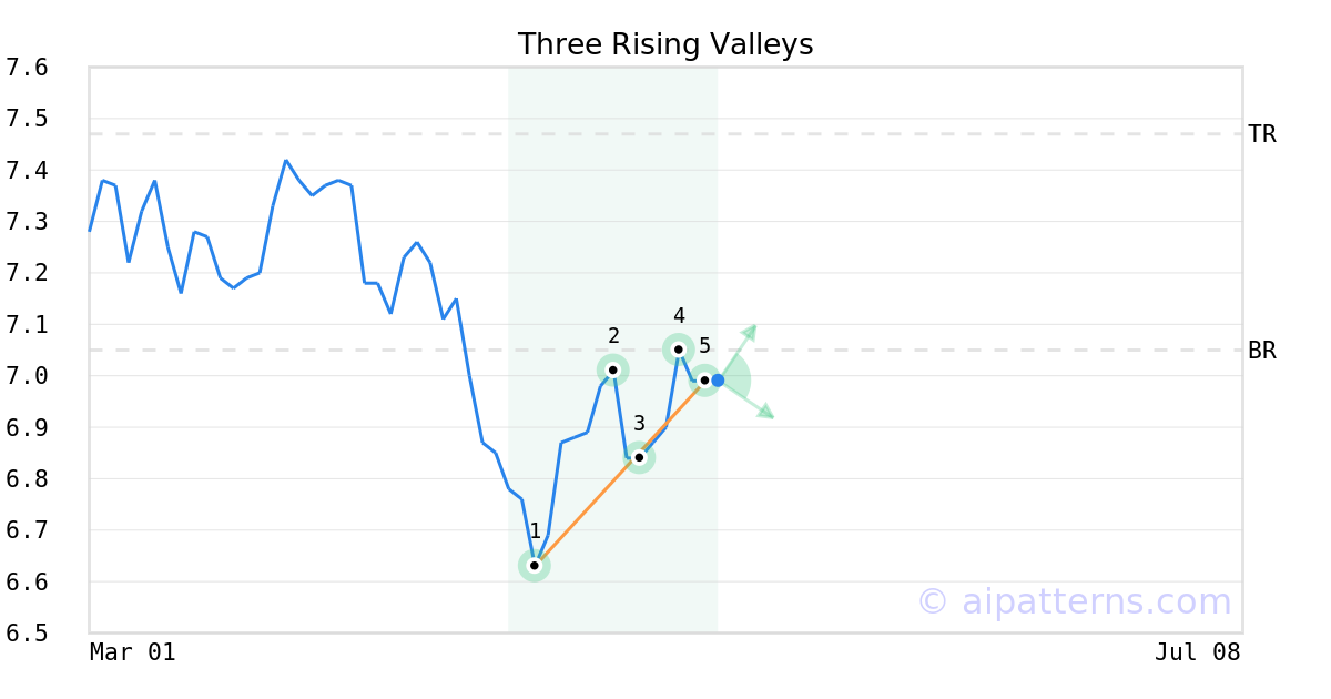 A.I.dvisor detected a bullish Three Rising Valleys pattern for PAHVX stock. This pattern was detected on May 08, 2024 . The odds of reaching the target price are 6. The Three Rising Valleys pattern forms when three minor Lows (1, 3, 5) are arranged along an upward sloping trend line. Consider buying a security or call option at the breakout price level. When trading, wait for the confirmation move, which is when the price rises above the breakout level.