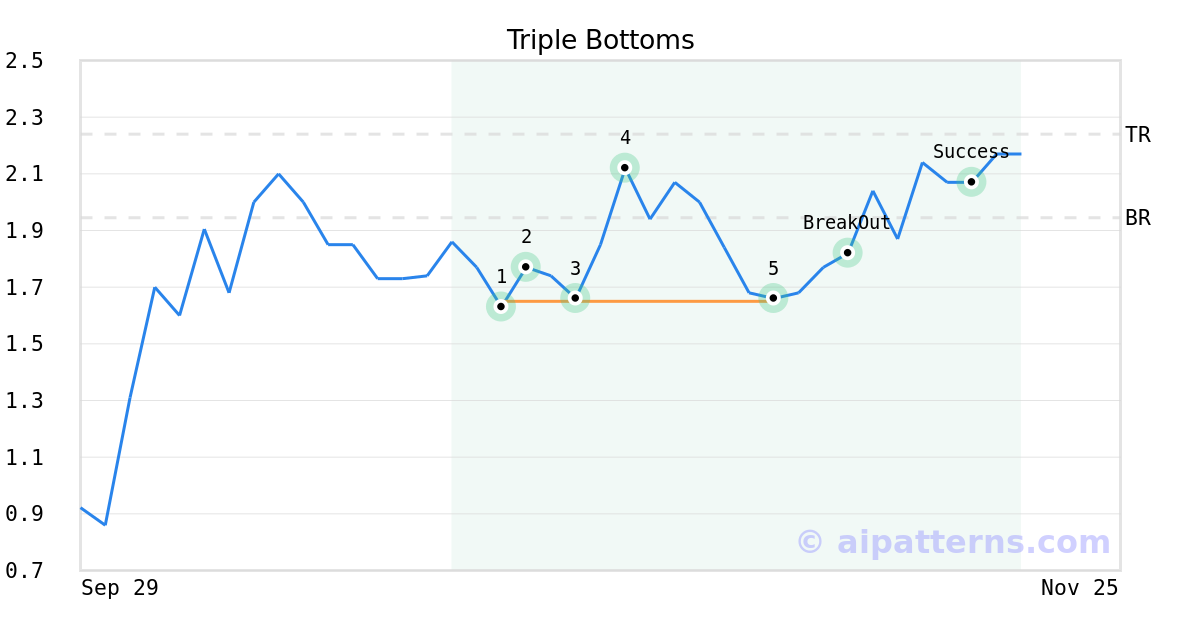 On November 06, 2025, A.I.dvisor detected a Triple Bottoms Pattern (Bullish) for Palisade Bio (PALI, $1.66). On November 11, 2025, A.I.dvisor confirmed the Bullish pattern, setting a target price of $2.24. 7 days later, on November 18, 2025, PALI reached the target price resulting in a +2 for traders who took a long position in the stock.