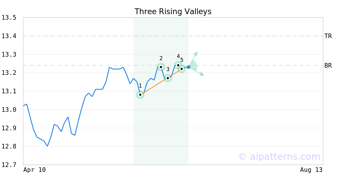 The Three Rising Valleys pattern forms when three minor Lows (1, 3, 5) are arranged along an upward sloping trend line.
