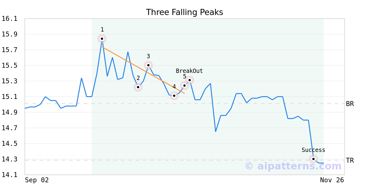 On October 15, 2025, A.I.dvisor detected a Three Falling Peaks Pattern (Bearish) for Pathfinder Bancorp (PBHC, $15.14). 1 day later, on October 16, 2025, A.I.dvisor confirmed the Bearish pattern, setting a target price of the stock. On November 19, 2025, the stock hit the target price of $14.29 – resulting in a gain for traders who shorted the stock on the pattern detection date.
