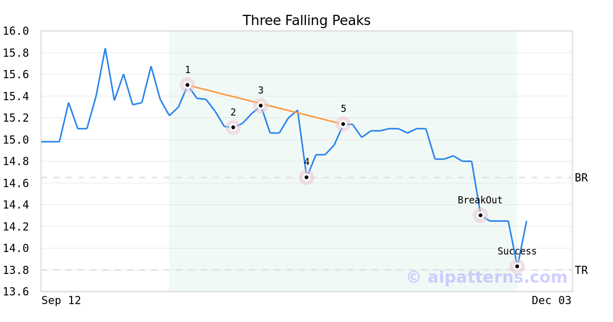 On October 29, 2025, A.I.dvisor detected a Three Falling Peaks Pattern (Bearish) for Pathfinder Bancorp (PBHC, $15.14). 21 days later, on November 19, 2025, A.I.dvisor confirmed the Bearish pattern, setting a target price of the stock. On November 25, 2025, the stock hit the target price of $13.80 – resulting in a gain for traders who shorted the stock on the pattern detection date.