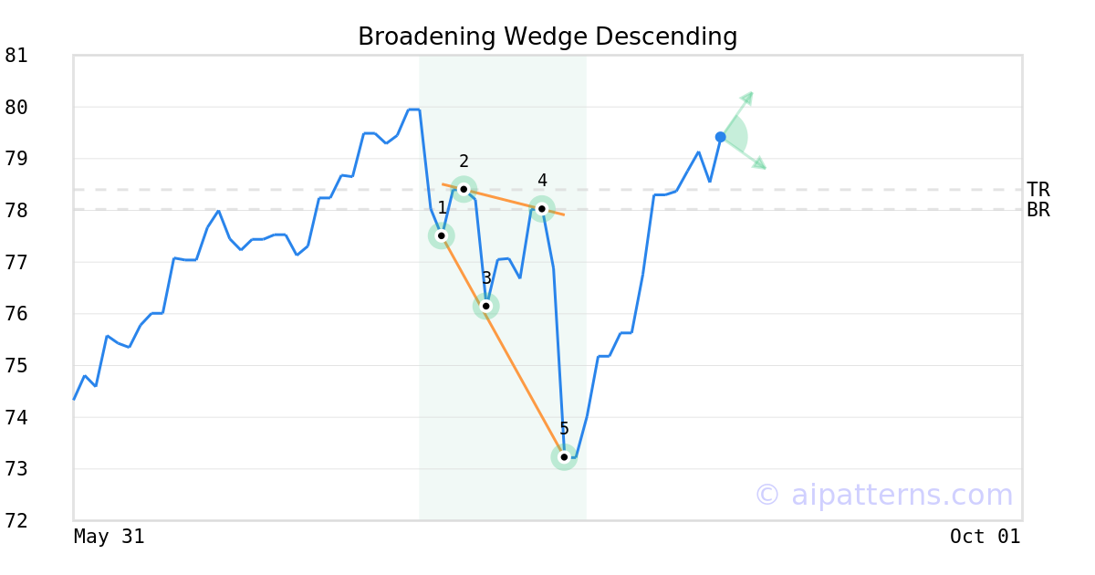 A.I.dvisor detected a bullish Broadening Wedge Descending pattern for PCAOX stock. This pattern was detected on August 05, 2024 . The odds of reaching the target price are 6. The Broadening Wedge Descending pattern forms when the price of a security makes lower lows (1, 3, 5) and lower highs (2, 4), forming a downtrend. Consider buying a security or call option at the upward breakout price level.