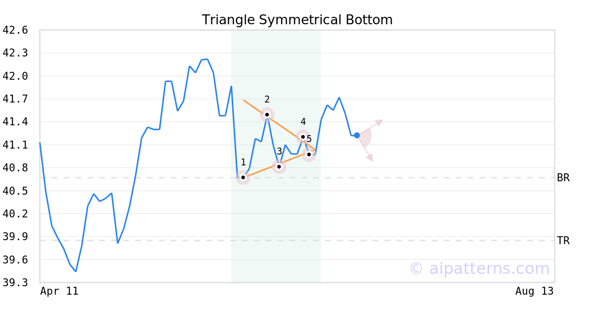 A.I.dvisor detected a bearish Triangle Symmetrical Bottom pattern for PCBIX stock. This pattern was detected on June 14, 2024 . The odds of reaching the target price are 6. The Symmetrical Triangle Bottom pattern forms when the price of a security fails to retest a high or a low and ultimately forms two narrowing trend lines. Points (1, 5) form the triangle patterns. Consider selling the security short or buying a put option at the downward breakout price level. When trading, wait for the confirmation move, which is when the price falls below the breakout level.