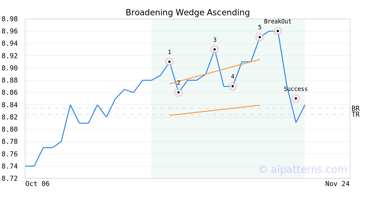 On November 11, 2025, A.I.dvisor detected a Broadening Wedge Ascending Pattern (Bearish) for Pimco California Municipal Income Fund (PCQ, $8.91). 2 days later, on November 13, 2025, A.I.dvisor confirmed the Bearish pattern, setting a target price of the stock. On November 17, 2025, the stock hit the target price of $8.82 – resulting in a gain for traders who shorted the stock on the pattern detection date.
