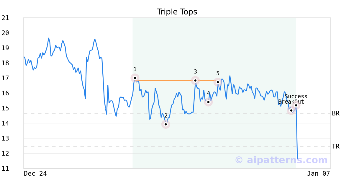 On August 22, 2025, A.I.dvisor detected a Triple Tops Pattern (Bearish) for PagerDuty (PD, $16.72). 89 days later, on November 19, 2025, A.I.dvisor confirmed the Bearish pattern, setting a target price of the stock. On November 25, 2025, the stock hit the target price of $12.47 – resulting in a gain for traders who shorted the stock on the pattern detection date.