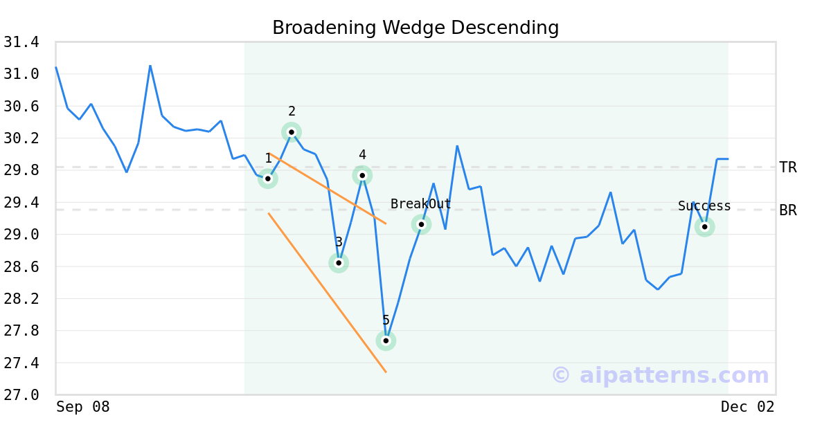 On October 16, 2025, A.I.dvisor detected a Broadening Wedge Descending Pattern (Bullish) for Peoples Bancorp (PEBO, $27.28). On October 21, 2025, A.I.dvisor confirmed the Bullish pattern, setting a target price of $29.84. 34 days later, on November 24, 2025, PEBO reached the target price resulting in a for traders who took a long position in the stock.