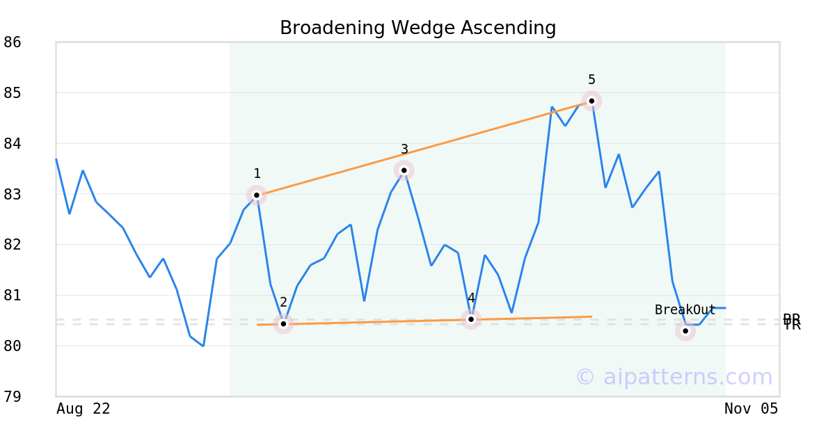 On October 20, 2025, A.I.dvisor detected a Broadening Wedge Ascending Pattern (Bearish) for Public Service Enterprise Group (PEG, $84.83). 9 days later, on October 29, 2025, A.I.dvisor confirmed the Bearish pattern, setting a target price of the stock. On October 29, 2025, the stock hit the target price of $80.43 – resulting in a gain for traders who shorted the stock on the pattern detection date.