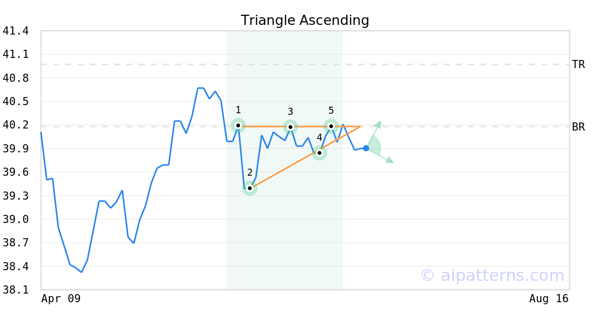 A.I.dvisor detected a bullish Triangle Ascending pattern for PEIIX stock. This pattern was detected on June 20, 2024 . The odds of reaching the target price are 6. The Ascending Triangle pattern forms when the price of a security tests a resistance level and creates a horizontal top line (1, 3, 5), with an upward-sloping bottom line (2, 4) formed by a rising support level. Consider buying a security at the upward breakout level.