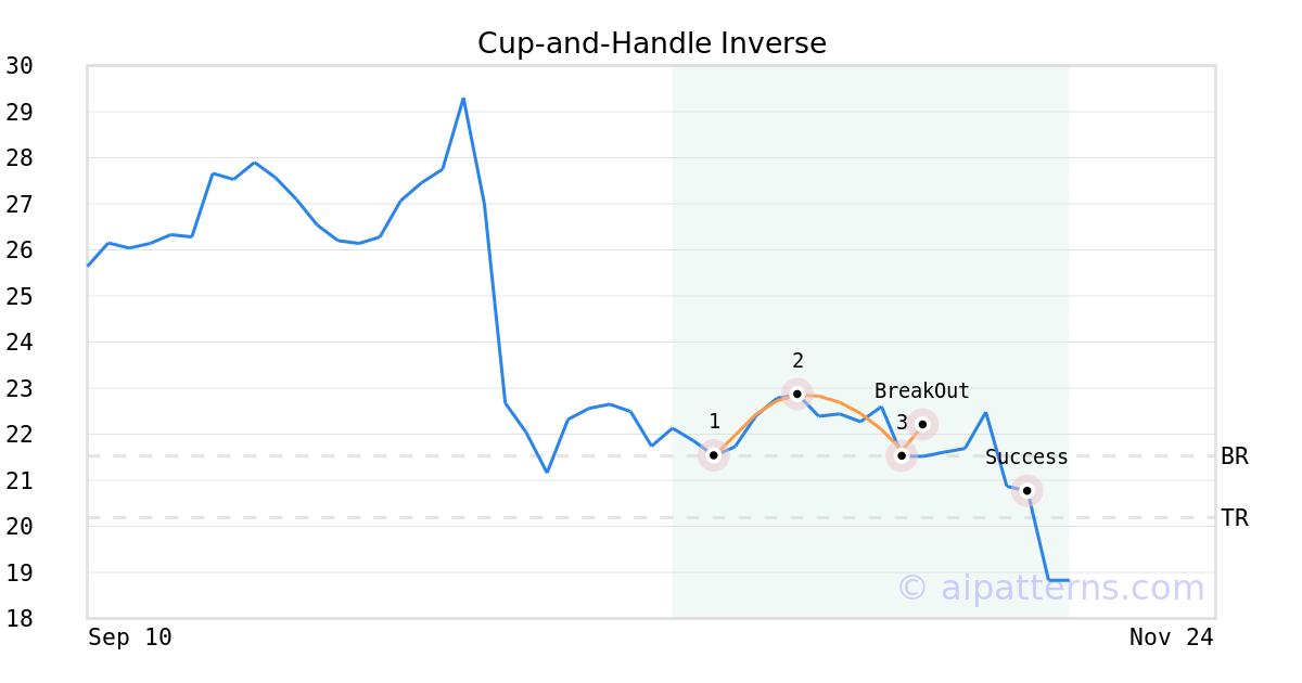 On November 05, 2025, A.I.dvisor detected a Cup-and-Handle Inverse Pattern (Bearish) for Penguin Solutions Inc (PENG, $22.20). On November 05, 2025, A.I.dvisor confirmed the Bearish pattern, setting a target price of the stock. On November 12, 2025, the stock hit the target price of $20.19 – resulting in a gain for traders who shorted the stock on the pattern detection date.