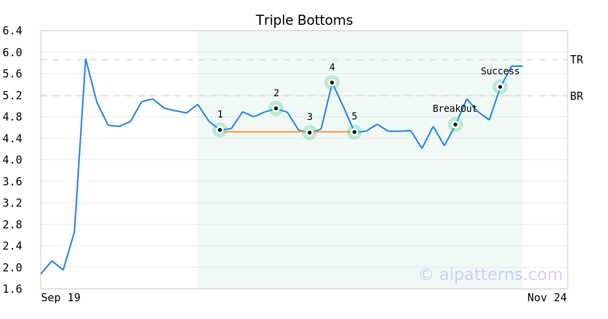 On October 29, 2025, A.I.dvisor detected a Triple Bottoms Pattern (Bullish) for PepGen (PEPG, $4.51). On November 11, 2025, A.I.dvisor confirmed the Bullish pattern, setting a target price of $5.86. 6 days later, on November 17, 2025, PEPG reached the target price resulting in a +1 for traders who took a long position in the stock.