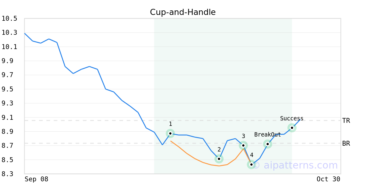 On October 16, 2025, A.I.dvisor detected a Cup-and-Handle Pattern (Bullish) for PennantPark Floating Rate Capital Ltd (PFLT, $8.43). On October 20, 2025, A.I.dvisor confirmed the Bullish pattern, setting a target price of $9.06. 3 days later, on October 23, 2025, PFLT reached the target price resulting in a for traders who took a long position in the stock.