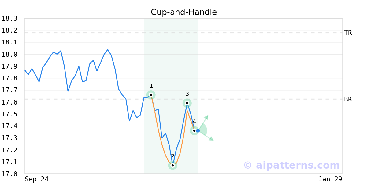 The Cup-and-Handle (sometimes called Cup-and-Holder) pattern is formed when the price of a security initially declines and then rises to form a “U”-like rounded shape (1, 2, 3, also known as the Cup). Once it forms the right lip, it is characterized by short, relatively straight price decline (from 3 to 4) forming the handle.