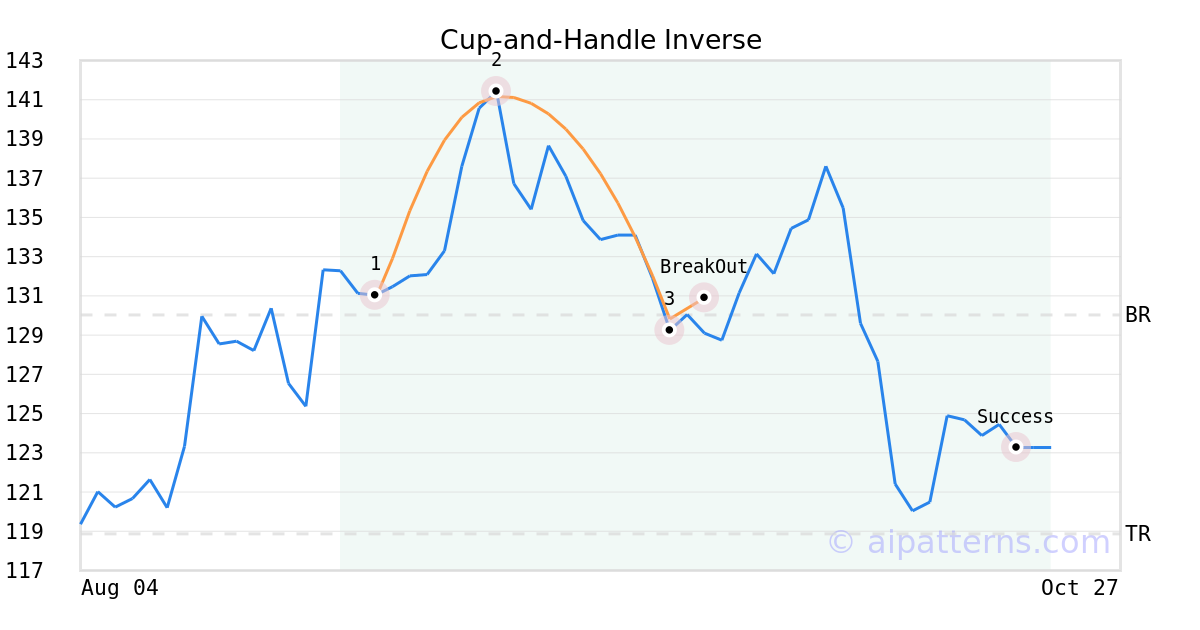 On September 24, 2025, A.I.dvisor detected a Cup-and-Handle Inverse Pattern (Bearish) for Pultegroup (PHM, $130.90). On September 24, 2025, A.I.dvisor confirmed the Bearish pattern, setting a target price of the stock. On October 20, 2025, the stock hit the target price of $118.87 – resulting in a gain for traders who shorted the stock on the pattern detection date.