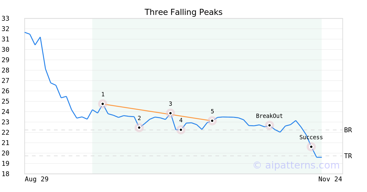 On October 21, 2025, A.I.dvisor detected a Three Falling Peaks Pattern (Bearish) for Phreesia (PHR, $23.11). 15 days later, on November 05, 2025, A.I.dvisor confirmed the Bearish pattern, setting a target price of the stock. On November 17, 2025, the stock hit the target price of $19.74 – resulting in a +1 gain for traders who shorted the stock on the pattern detection date.