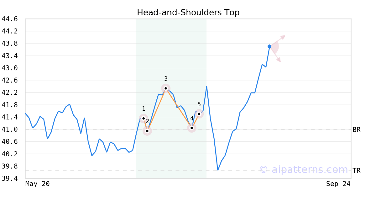 A.I.dvisor detected a bearish Head-and-Shoulders Top pattern for PICOX stock. This pattern was detected on July 29, 2024 . The odds of reaching the target price are 6. The pattern forms with a center peak (the Head, labeled 3) and left and right Shoulders (1, 5). Eventually the security stops testing highs and reverses trend into a decline. Consider selling a security short before it declines or buying a put option to benefit from the price decline. To improve success chances, wait for a confirmation move: allow the price to break below the Neckline level (2, 4), which is calculated as the average of the two lows between the Head and the Shoulders.