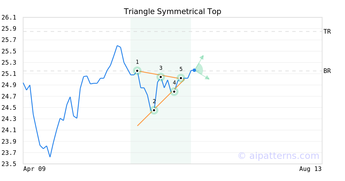 A.I.dvisor detected a bullish Triangle Symmetrical Top pattern for PIEJX stock. This pattern was detected on June 14, 2024 . The odds of reaching the target price are 6. The Symmetrical Triangle Top pattern forms when the price of a security fails to retest a high or low and ultimately forms two narrowing trend lines. Consider buying a security or call option at the breakout price level. When trading, wait for the confirmation move, which is when the price rises above the breakout level.