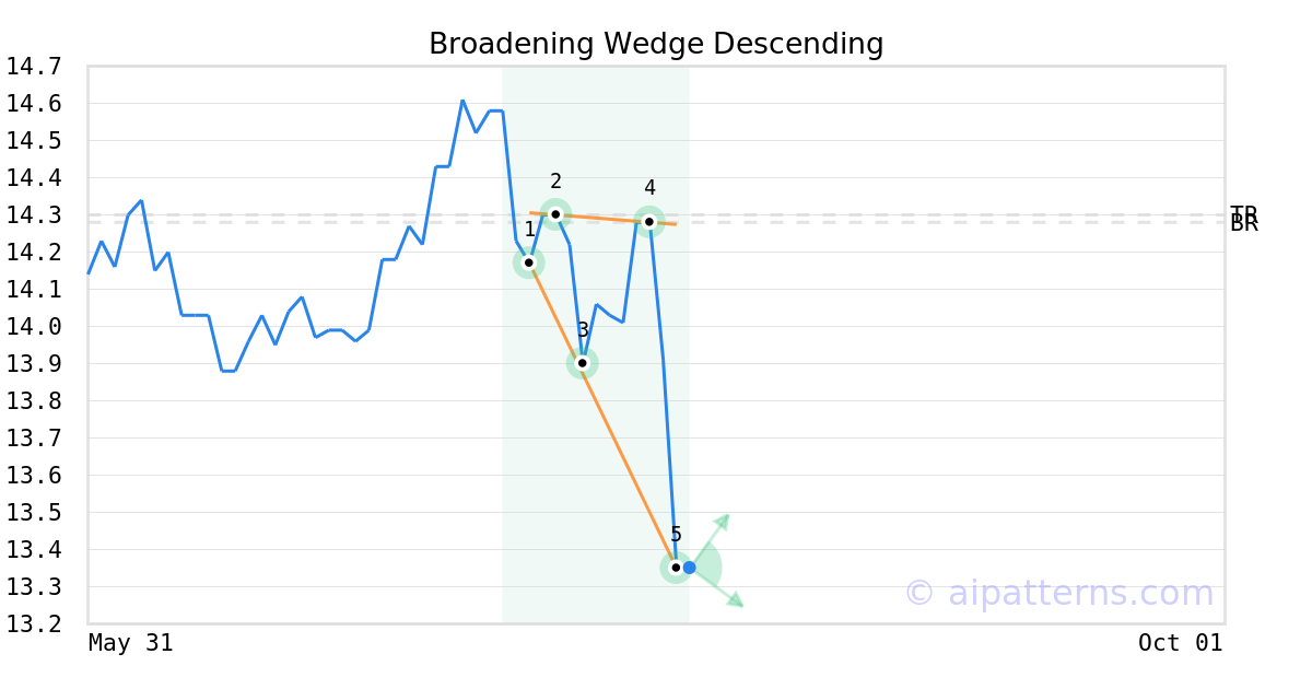 The Broadening Wedge Descending pattern forms when the price of a security makes lower lows (1, 3, 5) and lower highs (2, 4), forming a downtrend.