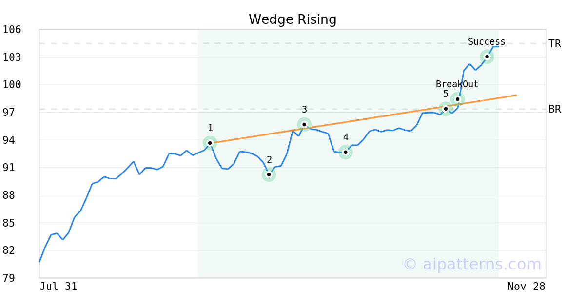 On November 06, 2025, A.I.dvisor detected a Wedge Rising Pattern (Bullish) for Invesco Pharmaceuticals ETF (PJP, $97.35). On November 10, 2025, A.I.dvisor confirmed the Bullish pattern, setting a target price of $104.49. 7 days later, on November 17, 2025, PJP reached the target price resulting in a for traders who took a long position in the stock.